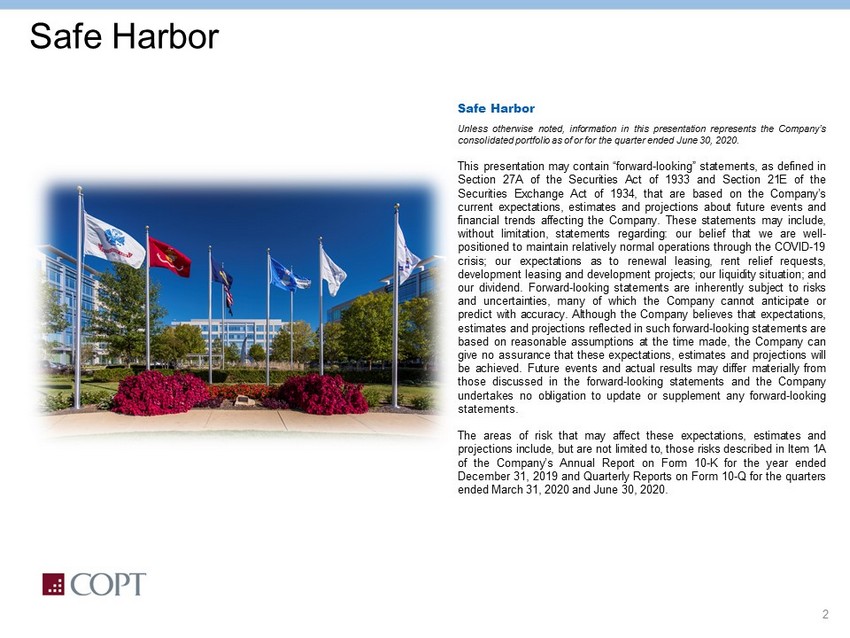 1 Safe Harbor Safe Harbor Unless otherwise noted, information in this presentation represents the Company’s consolidated portfolio as of or for the quarter ended June 30 , 2020 . This presentation may contain “forward - looking” statements, as defined in Section 27 A of the Securities Act of 1933 and Section 21 E of the Securities Exchange Act of 1934 , that are based on the Company’s current expectations, estimates and projections about future events and financial trends affecting the Company . These statements may include, without limitation, statements regarding : our belief that we are well - positioned to maintain relatively normal operations through the COVID - 19 crisis ; our expectations as to renewal leasing, rent relief requests, development leasing and development projects ; our liquidity situation ; and our dividend . Forward - looking statements are inherently subject to risks and uncertainties, many of which the Company cannot anticipate or predict with accuracy . Although the Company believes that expectations, estimates and projections reflected in such forward - looking statements are based on reasonable assumptions at the time made, the Company can give no assurance that these expectations, estimates and projections will be achieved . Future events and actual results may differ materially from those discussed in the forward - looking statements and the Company undertakes no obligation to update or supplement any forward - looking statements . The areas of risk that may affect these expectations, estimates and projections include, but are not limited to, those risks described in Item 1 A of the Company’s Annual Report on Form 10 - K for the year ended December 31 , 2019 and Quarterly Reports on Form 10 - Q for the quarters ended March 31 , 2020 and June 30 , 2020 .