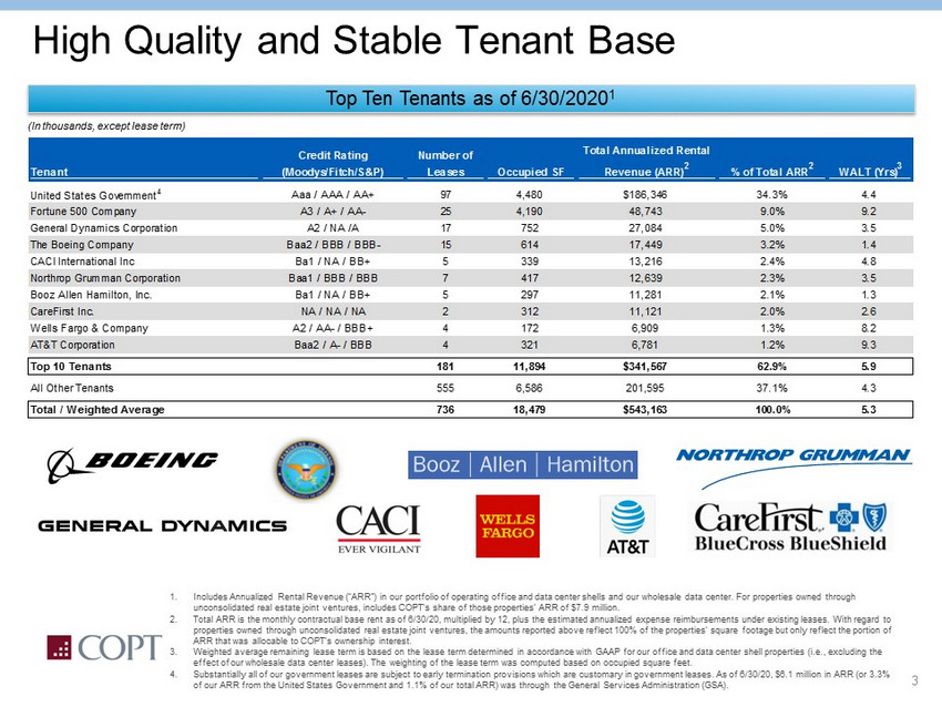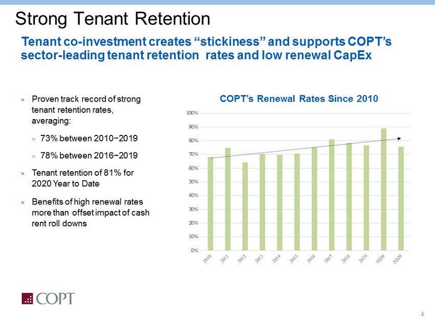 3 High Quality and Stable Tenant Base Top Ten Tenants as of 6/30/2020 1 (In thousands, except lease term) Tenant Credit Rating (Moodys/Fitch/S&P) Number of Leases Occupied SF Total Annualized Rental Revenue (ARR) 2 % of Total ARR 2 WALT (Yrs) 3 United States Government 4 Aaa / AAA / AA+ 97 4,480 $186,346 34.3% 4.4 Fortune 500 Company A3 / A+ / AA- 25 4,190 48,743 9.0% 9.2 General Dynamics Corporation A2 / NA /A 17 752 27,084 5.0% 3.5 The Boeing Company Baa2 / BBB / BBB- 15 614 17,449 3.2% 1.4 CACI International Inc Ba1 / NA / BB+ 5 339 13,216 2.4% 4.8 Northrop Grumman Corporation Baa1 / BBB / BBB 7 417 12,639 2.3% 3.5 Booz Allen Hamilton, Inc. Ba1 / NA / BB+ 5 297 11,281 2.1% 1.3 CareFirst Inc. NA / NA / NA 2 312 11,121 2.0% 2.6 Wells Fargo & Company A2 / AA- / BBB+ 4 172 6,909 1.3% 8.2 AT&T Corporation Baa2 / A- / BBB 4 321 6,781 1.2% 9.3 Top 10 Tenants 181 11,894 $341,567 62.9% 5.9 All Other Tenants 555 6,586 201,595 37.1% 4.3 Total / Weighted Average 736 18,479 $543,163 100.0% 5.3 1. Includes Annualized Rental Revenue (“ARR”) in our portfolio of operating office and data center shells and our wholesale data ce nter. For properties owned through unconsolidated real estate joint ventures, includes COPT’s share of those properties’ ARR of $7.9 million. 2. Total ARR is the monthly contractual base rent as of 6/30/20, multiplied by 12, plus the estimated annualized expense reimbur sem ents under existing leases. With regard to properties owned through unconsolidated real estate joint ventures, the amounts reported above reflect 100% of the properties ’ s quare footage but only reflect the portion of ARR that was allocable to COPT’s ownership interest. 3. Weighted average remaining lease term is based on the lease term determined in accordance with GAAP for our office and data c ent er shell properties (i.e., excluding the effect of our wholesale data center leases). The weighting of the lease term was computed based on occupied square feet. 4. Substantially all of our government leases are subject to early termination provisions which are customary in government leas es. As of 6/30/20, $6.1 million in ARR (or 3.3% of our ARR from the United States Government and 1.1% of our total ARR) was through the General Services Administration (GSA) .