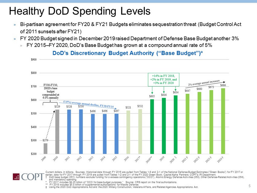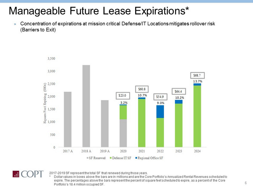 5 SEQUESTRATION Healthy DoD Spending Levels » Bi - partisan agreement for FY20 & FY21 Budgets eliminates sequestration threat (Budget Control Act of 2011 sunsets after FY21) » FY 2020 Budget signed in December 2019 raised Department of Defense Base Budget another 3% » FY 2015 – FY 2020, DoD’s Base Budget has grown at a compound annual rate of 5% DoD’s Discretionary Budget Authority (“Base Budget”)* Current dollars, in billions. Sources: Historical data through FY 2016 are pulled from Tables 1 - 9 and 2 - 1 of the National Defen se Budget Estimates ("Green Books") for FY 2017 or earlier; data for FY 2017 through FY 2019 are pulled from Tables 1 - 2 and 2 - 1 of the FY 2020 Green Book; Capital Alpha Partners; COPT’s IR Department. † DoD base budget (051) numbers exclude funding for overseas contingency operations ("OCO"), Atomic Energy Defense Activiti es (053), Other Defense - Related Activities (054), and mandatory spending. * FY 2017 includes $8.25 billion of "OCO for base budget purposes." Source: CRS report on the final authorizations. ** FY 2018 includes $5.8 billion of supplemental authorizations for Missile Defense. ‡ Using the 2020 DoD Appropriations Act and the 2020 Military Construction, Veterans Affairs, and Related Agencies Appropri ati ons Act.