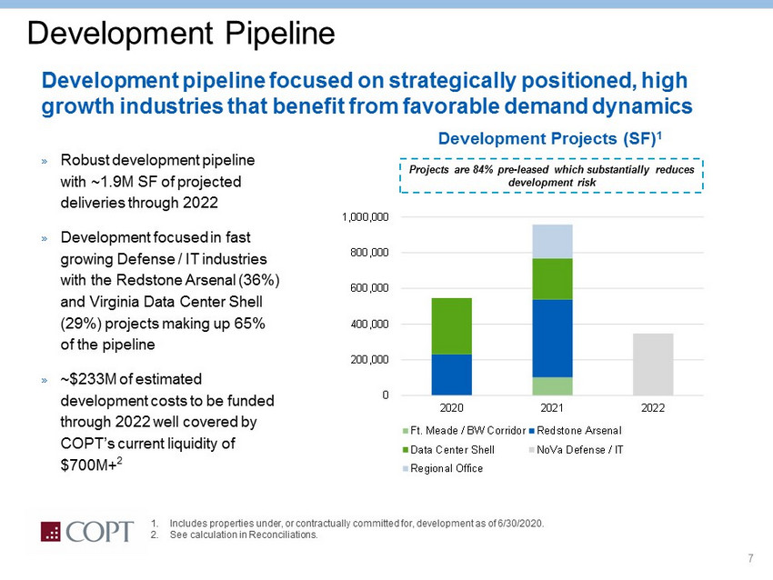 6 Manageable Future Lease Expirations* » Concentration of expirations at mission critical Defense/IT Locations mitigates rollover risk (Barriers to Exit) 2017 - 2019 SF represent the total SF that renewed during those years. * Dollar values in boxes above the bars are in millions and are the Core Portfolio’s Annualized Rental Revenues scheduled to expire. The percentages above the bars represent the percent of square feet scheduled to expire, as a percent of the Core Portfolio’s 18.4 million occupied SF. 0 500 1,000 1,500 2,000 2,500 3,000 3,500 2017 A 2018 A 2019 A 2020 2021 2022 2023 2024 Square Feet Expiring (000s) SF Renewed Defense/IT SF Regional Office SF 10.7% 9.0% 10.2% 13.7% 3.2% $23.0 $60.8 $54.9 $64.4 $68.7