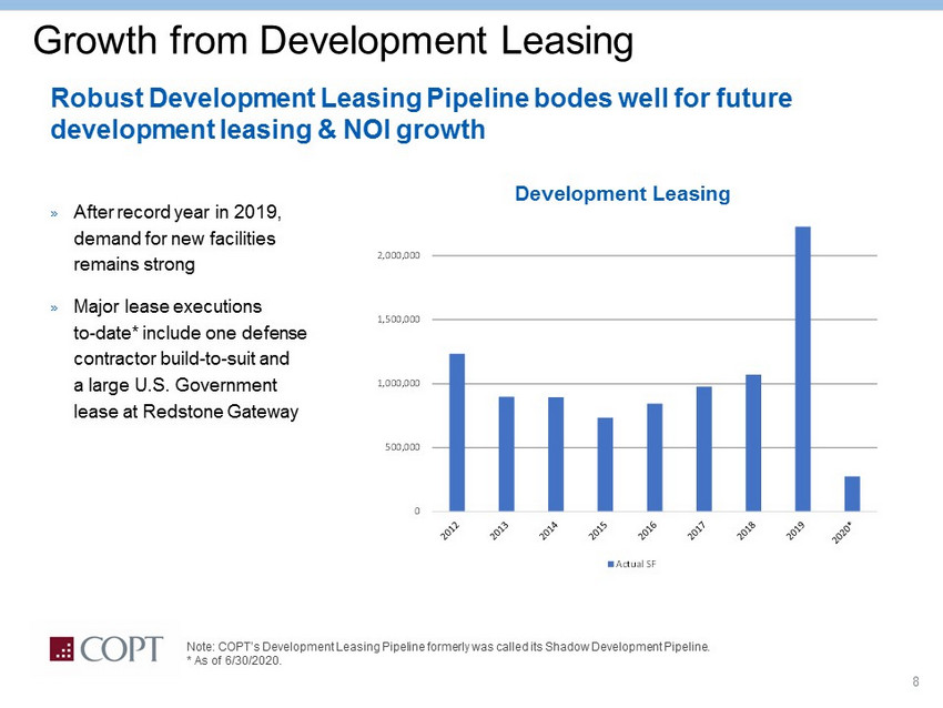 7 1. Includes properties under, or contractually committed for, development as of 6/30/2020. 2. See calculation in Reconciliations. Development Pipeline Development Projects (SF) 1 0 200,000 400,000 600,000 800,000 1,000,000 2020 2021 2022 Ft. Meade / BW Corridor Redstone Arsenal Data Center Shell NoVa Defense / IT Regional Office Development pipeline focused on strategically positioned, high growth industries that benefit from favorable demand dynamics » Robust development pipeline with ~1.9M SF of projected deliveries through 2022 » Development focused in fast growing Defense / IT industries with the Redstone Arsenal (36%) and Virginia Data Center Shell (29%) projects making up 65% of the pipeline » ~$233M of estimated development costs to be funded through 2022 well covered by COPT’s current liquidity of $700M+ 2 Projects are 84% pre - leased which substantially reduces development risk