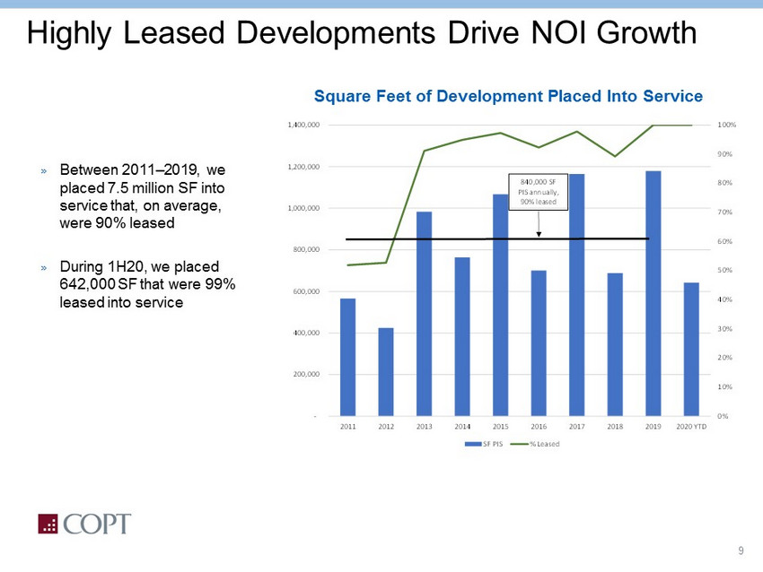 8 Growth from Development Leasing Note: COPT’s Development Leasing Pipeline formerly was called its Shadow Development Pipeline. * As of 6/30/2020. Development Leasing » After record year in 2019, demand for new facilities remains strong » Major lease executions to - date* include one defense contractor build - to - suit and a large U.S. Government lease at Redstone Gateway Robust Development Leasing Pipeline bodes well for future development leasing & NOI growth 0 500,000 1,000,000 1,500,000 2,000,000 Actual SF