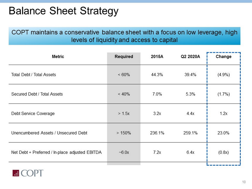 9 Highly Leased Developments Drive NOI Growth » Between 2011 – 2019, we placed 7.5 million SF into service that, on average, were 90% leased » During 1H20, we placed 642,000 SF that were 99% leased into service Square Feet of Development Placed Into Service 0% 10% 20% 30% 40% 50% 60% 70% 80% 90% 100% - 200,000 400,000 600,000 800,000 1,000,000 1,200,000 1,400,000 2011 2012 2013 2014 2015 2016 2017 2018 2019 2020 YTD SF PIS % Leased 840,000 SF PIS annually, 90% leased