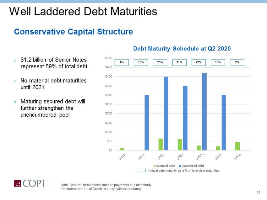 10 Balance Sheet Strategy COPT maintains a conservative balance sheet with a focus on low leverage, high levels of liquidity and access to capital Metric Required 2015A Q2 2020A Change Total Debt / Total Assets < 60% 44.3% 39.4% (4.9%) Secured Debt / Total Assets < 40% 7.0% 5.3% (1.7%) Debt Service Coverage > 1.5x 3.2x 4.4x 1.2x Unencumbered Assets / Unsecured Debt > 150% 236.1% 259.1% 23.0% Net Debt + Preferred / In - place adjusted EBITDA ~6.0x 7.2x 6.4x (0.8x)