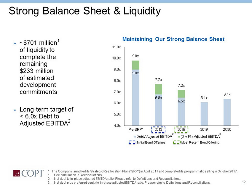 11 Well Laddered Debt Maturities Conservative Capital Structure » $1.2 billion of Senior Notes represent 59% of total debt » No material debt maturities until 2021 » Maturing secured debt will further strengthen the unencumbered pool Debt Maturity Schedule at Q2 2020 $0 $50 $100 $150 $200 $250 $300 $350 $400 $450 $500 Secured debt Unsecured debt Note: Secured debt reflects balloon payments due at maturity. * Includes the Line of Credit maturity (with extensions) * 1% 15% 23% 21% 22% 16% 2% Annual debt maturity as a % of total debt maturities