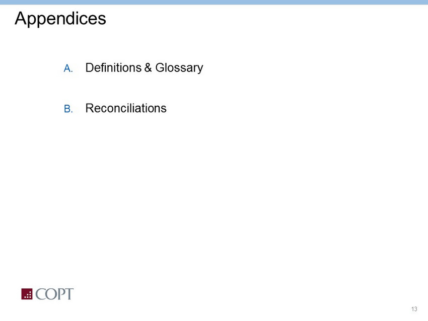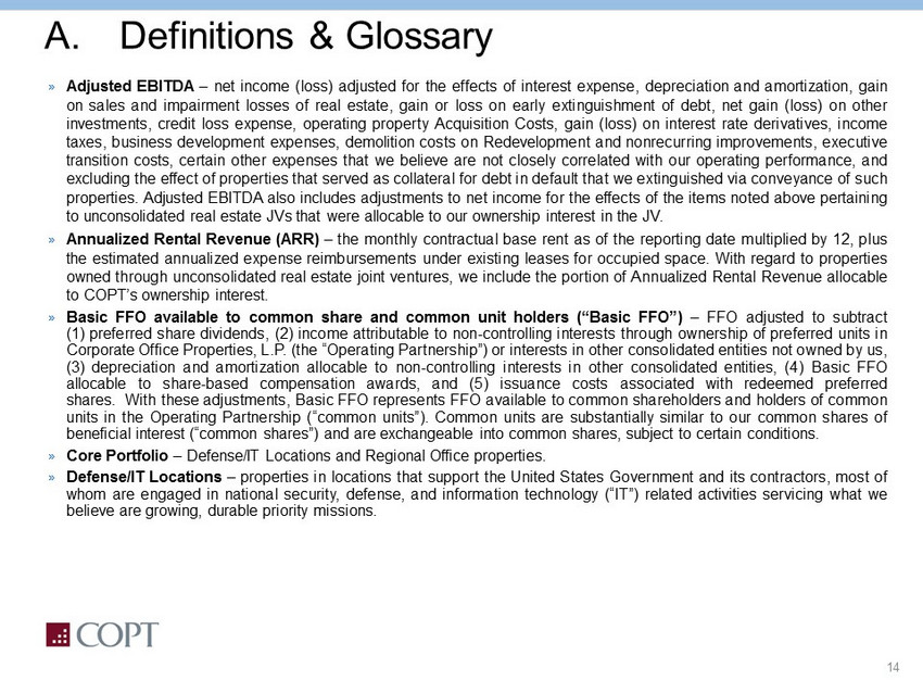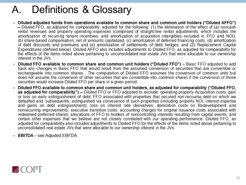 14 A. Definitions & Glossary » Adjusted EBITDA – net income (loss) adjusted for the effects of interest expense, depreciation and amortization, gain on sales and impairment losses of real estate, gain or loss on early extinguishment of debt, net gain (loss) on other investments, credit loss expense, operating property Acquisition Costs, gain (loss) on interest rate derivatives, income taxes, business development expenses, demolition costs on Redevelopment and nonrecurring improvements, executive transition costs, certain other expenses that we believe are not closely correlated with our operating performance, and excluding the effect of properties that served as collateral for debt in default that we extinguished via conveyance of such properties . Adjusted EBITDA also includes adjustments to net income for the effects of the items noted above pertaining to unconsolidated real estate JVs that were allocable to our ownership interest in the JV . » Annualized Rental Revenue (ARR) – the monthly contractual base rent as of the reporting date multiplied by 12 , plus the estimated annualized expense reimbursements under existing leases for occupied space . With regard to properties owned through unconsolidated real estate joint ventures, we include the portion of Annualized Rental Revenue allocable to COPT’s ownership interest . » Basic FFO available to common share and common unit holders (“Basic FFO”) – FFO adjusted to subtract ( 1 ) preferred share dividends, ( 2 ) income attributable to non - controlling interests through ownership of preferred units in Corporate Office Properties, L . P . (the “Operating Partnership”) or interests in other consolidated entities not owned by us, ( 3 ) depreciation and amortization allocable to non - controlling interests in other consolidated entities, ( 4 ) Basic FFO allocable to share - based compensation awards, and ( 5 ) issuance costs associated with redeemed preferred shares . With these adjustments, Basic FFO represents FFO available to common shareholders and holders of common units in the Operating Partnership (“common units”) . Common units are substantially similar to our common shares of beneficial interest (“common shares”) and are exchangeable into common shares, subject to certain conditions . » Core Portfolio – Defense/IT Locations and Regional Office properties . » Defense/IT Locations – properties in locations that support the United States Government and its contractors, most of whom are engaged in national security, defense, and information technology (“IT”) related activities servicing what we believe are growing, durable priority missions .