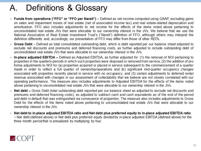 16 A. Definitions & Glossary » Funds from operations (“FFO” or “FFO per Nareit ”) – Defined as net income computed using GAAP, excluding gains on sales and impairment losses of real estate (net of associated income tax) and real estate - related depreciation and amortization . FFO also includes adjustments to net income for the effects of the items noted above pertaining to unconsolidated real estate JVs that were allocable to our ownership interest in the JVs . We believe that we use the National Association of Real Estate Investment Trust’s (“ Nareit ”) definition of FFO, although others may interpret the definition differently and, accordingly, our presentation of FFO may differ from those of other REITs . » Gross Debt – Defined as total consolidated outstanding debt, which is debt reported per our balance sheet adjusted to exclude net discounts and premiums and deferred financing costs, as further adjusted to include outstanding debt of unconsolidated real estate JVs that were allocable to our ownership interest in the JVs . » In - place adjusted EBITDA – Defined as Adjusted EBITDA, as further adjusted for : ( 1 ) the removal of NOI pertaining to properties in the quarterly periods in which such properties were disposed or removed from service ; ( 2 ) the addition of pro forma adjustments to NOI for (a) properties acquired or placed in service subsequent to the commencement of a quarter made in order to reflect a full quarter of ownership/operations and (b) significant mid - quarter occupancy changes associated with properties recently placed in service with no occupancy ; and ( 3 ) certain adjustments to deferred rental revenue associated with changes in our assessment of collectability that we believe are not closely correlated with our operating performance . The measure also includes adjustments to Adjusted EBITDA for the effects of the items noted above pertaining to unconsolidated real estate JVs that were allocable to our ownership interest in the JVs . » Net debt – Gross Debt (total outstanding debt reported per our balance sheet as adjusted to exclude net discounts and premiums and deferred financing costs), as adjusted to subtract cash and cash equivalents as of the end of the period and debt in default that was extinguished via conveyance of properties . The measure also includes adjustments to Gross Debt for the effects of the items noted above pertaining to unconsolidated real estate JVs that were allocable to our ownership interest in the JVs . » Net debt to in - place adjusted EBITDA ratio and Net debt plus preferred equity to in - place adjusted EBITDA ratio – Net debt (defined above) or Net debt plus preferred equity divided by in - place adjusted EBITDA (defined above) for the three month period that is annualized by multiplying by four.