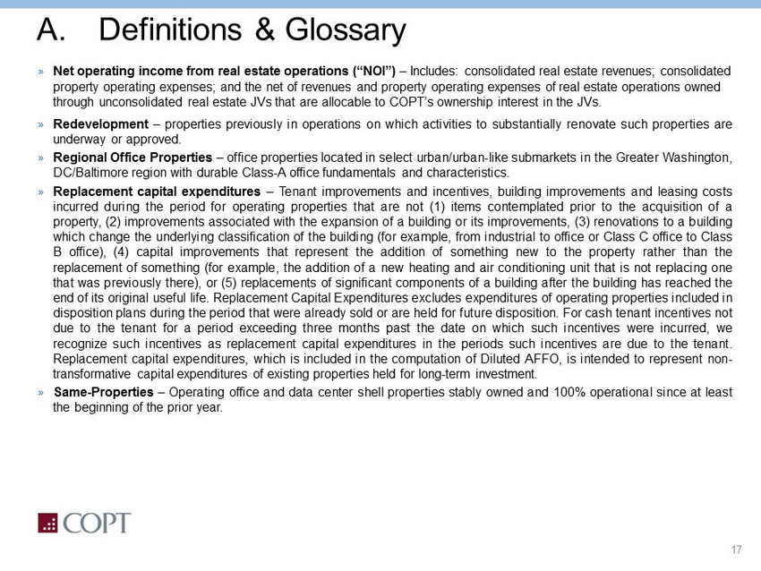 17 A. Definitions & Glossary » Net operating income from real estate operations (“NOI”) – Includes: consolidated real estate revenues; consolidated property operating expenses; and the net of revenues and property operating expenses of real estate operations owned through unconsolidated real estate JVs that are allocable to COPT’s ownership interest in the JVs. » Redevelopment – properties previously in operations on which activities to substantially renovate such properties are underway or approved . » Regional Office Properties – office properties located in select urban/urban - like submarkets in the Greater Washington, DC/Baltimore region with durable Class - A office fundamentals and characteristics . » Replacement capital expenditures – Tenant improvements and incentives, building improvements and leasing costs incurred during the period for operating properties that are not ( 1 ) items contemplated prior to the acquisition of a property, ( 2 ) improvements associated with the expansion of a building or its improvements, ( 3 ) renovations to a building which change the underlying classification of the building (for example, from industrial to office or Class C office to Class B office), ( 4 ) capital improvements that represent the addition of something new to the property rather than the replacement of something (for example, the addition of a new heating and air conditioning unit that is not replacing one that was previously there), or ( 5 ) replacements of significant components of a building after the building has reached the end of its original useful life . Replacement Capital Expenditures excludes expenditures of operating properties included in disposition plans during the period that were already sold or are held for future disposition . For cash tenant incentives not due to the tenant for a period exceeding three months past the date on which such incentives were incurred, we recognize such incentives as replacement capital expenditures in the periods such incentives are due to the tenant . Replacement capital expenditures, which is included in the computation of Diluted AFFO, is intended to represent non - transformative capital expenditures of existing properties held for long - term investment . » Same - Properties – Operating office and data center shell properties stably owned and 100 % operational since at least the beginning of the prior year .