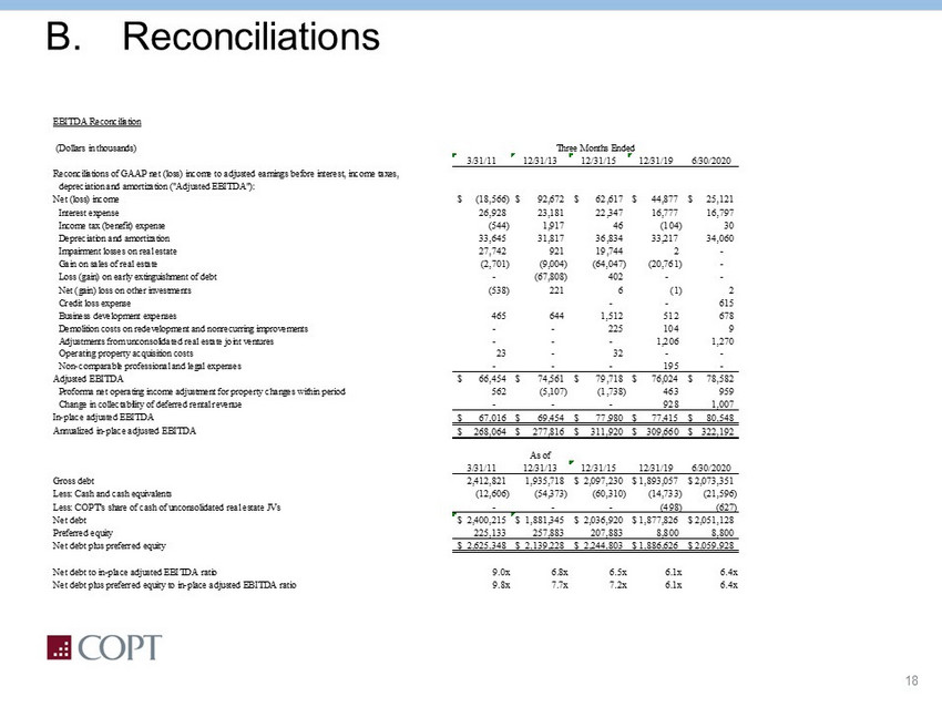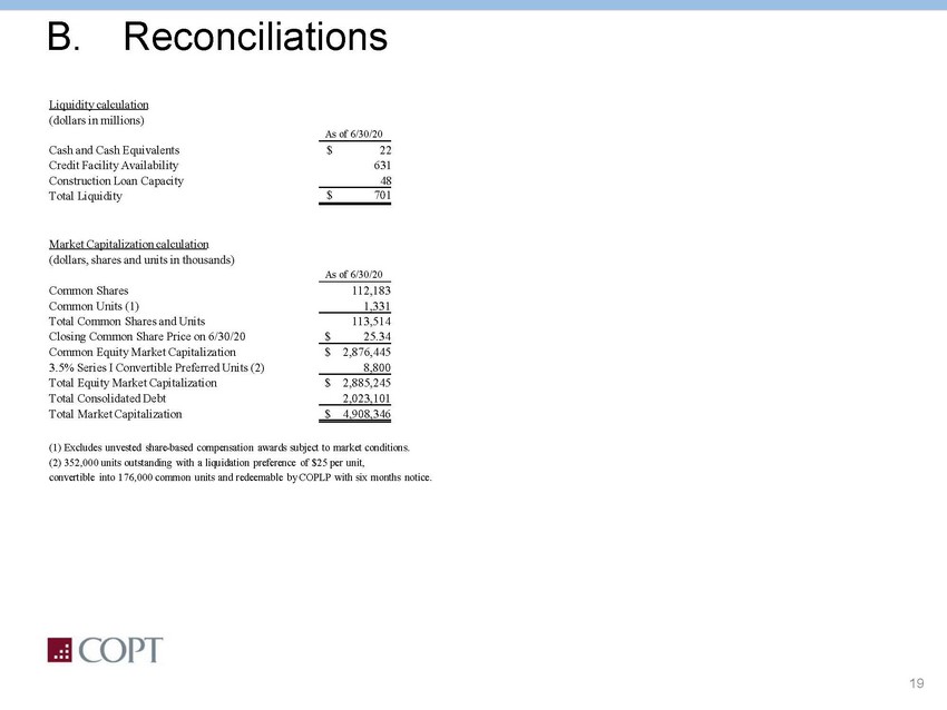18 B. Reconciliations EBITDA Reconciliation (Dollars in thousands) 3/31/11 12/31/13 12/31/15 12/31/19 6/30/2020 Reconciliations of GAAP net (loss) income to adjusted earnings before interest, income taxes, depreciation and amortization ("Adjusted EBITDA"): Net (loss) income (18,566)$ 92,672$ 62,617$ 44,877$ 25,121$ Interest expense 26,928 23,181 22,347 16,777 16,797 Income tax (benefit) expense (544) 1,917 46 (104) 30 Depreciation and amortization 33,645 31,817 36,834 33,217 34,060 Impairment losses on real estate 27,742 921 19,744 2 - Gain on sales of real estate (2,701) (9,004) (64,047) (20,761) - Loss (gain) on early extinguishment of debt - (67,808) 402 - - Net (gain) loss on other investments (538) 221 6 (1) 2 Credit loss expense - - 615 Business development expenses 465 644 1,512 512 678 Demolition costs on redevelopment and nonrecurring improvements - - 225 104 9 Adjustments from unconsolidated real estate joint ventures - - - 1,206 1,270 Operating property acquisition costs 23 - 32 - - Non-comparable professional and legal expenses - - - 195 - Adjusted EBITDA 66,454$ 74,561$ 79,718$ 76,024$ 78,582$ Proforma net operating income adjustment for property changes within period 562 (5,107) (1,738) 463 959 Change in collectability of deferred rental revenue - - - 928 1,007 In-place adjusted EBITDA 67,016$ 69,454$ 77,980$ 77,415$ 80,548$ Annualized in-place adjusted EBITDA 268,064$ 277,816$ 311,920$ 309,660$ 322,192$ 3/31/11 12/31/13 12/31/15 12/31/19 6/30/2020 Gross debt 2,412,821 1,935,718 2,097,230$ 1,893,057$ 2,073,351$ Less: Cash and cash equivalents (12,606) (54,373) (60,310) (14,733) (21,596) Less: COPT's share of cash of unconsolidated real estate JVs - - - (498) (627) Net debt 2,400,215$ 1,881,345$ 2,036,920$ 1,877,826$ 2,051,128$ Preferred equity 225,133 257,883 207,883 8,800 8,800 Net debt plus preferred equity 2,625,348$ 2,139,228$ 2,244,803$ 1,886,626$ 2,059,928$ Net debt to in-place adjusted EBITDA ratio 9.0x 6.8x 6.5x 6.1x 6.4x Net debt plus preferred equity to in-place adjusted EBITDA ratio 9.8x 7.7x 7.2x 6.1x 6.4x As of Three Months Ended