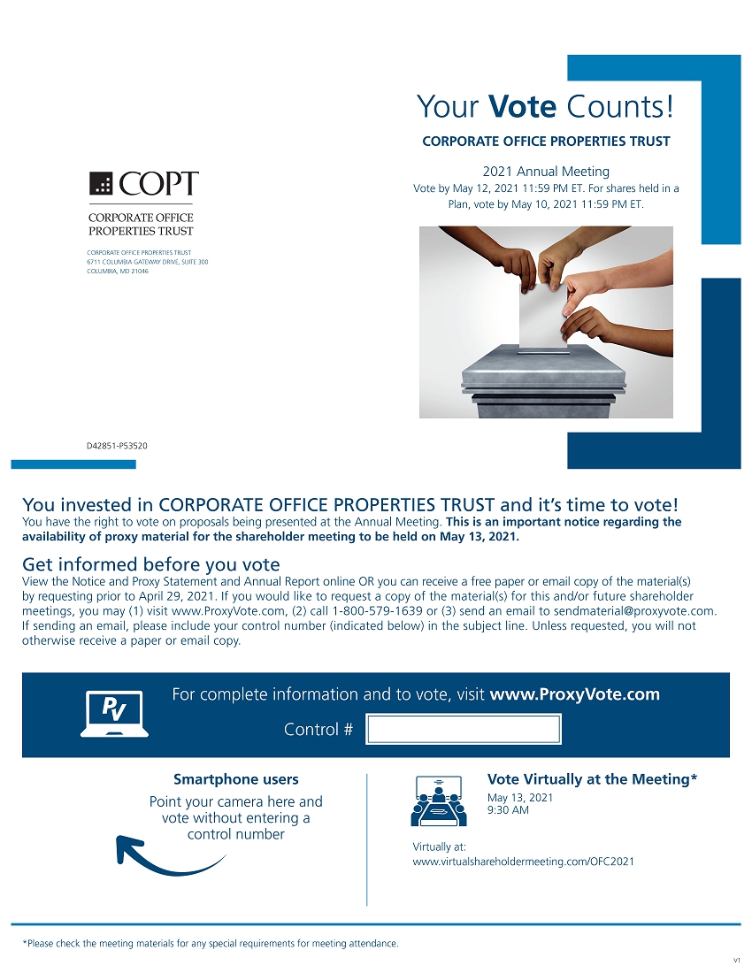 Your Vote Counts! CORPORATE OFFICE PROPERTIES TRUST 2021 Annual Meeting Vote by May 12, 2021 11:59 PM ET. For shares held in a Plan, vote by May 10, 2021 11:59 PM ET.CORPORATE OFFICE PROPERTIES TRUST 6711 COLUMBIA GATEWAY DRIVE, SUITE 300 COLUMBIA, MD 21046D42851-P53520You invested in CORPORATE OFFICE PROPERTIES TRUST and it’s time to vote! You have the right to vote on proposals being presented at the Annual Meeting. This is an important notice regarding the availability of proxy material for the shareholder meeting to be held on May 13, 2021. Get informed before you vote View the Notice and Proxy Statement and Annual Report online OR you can receive a free paper or email copy of the material(s) by requesting prior to April 29, 2021. If you would like to request a copy of the material(s) for this and/or future shareholder meetings, you may (1) visit www.ProxyVote.com, (2) call 1-800-579-1639 or (3) send an email to sendmaterial@proxyvote.com. If sending an email, please include your control number (indicated below) in the subject line. Unless requested, you will not otherwise receive a paper or email copy.For complete information and to vote, visit www.ProxyVote.com Control #Smartphone users Point your camera here and vote without entering a control numberVirtually at:Vote Virtually at the Meeting* May 13, 2021 9:30 AMwww.virtualshareholdermeeting.com/OFC2021*Please check the meeting materials for any special requirements for meeting attendance.V1
