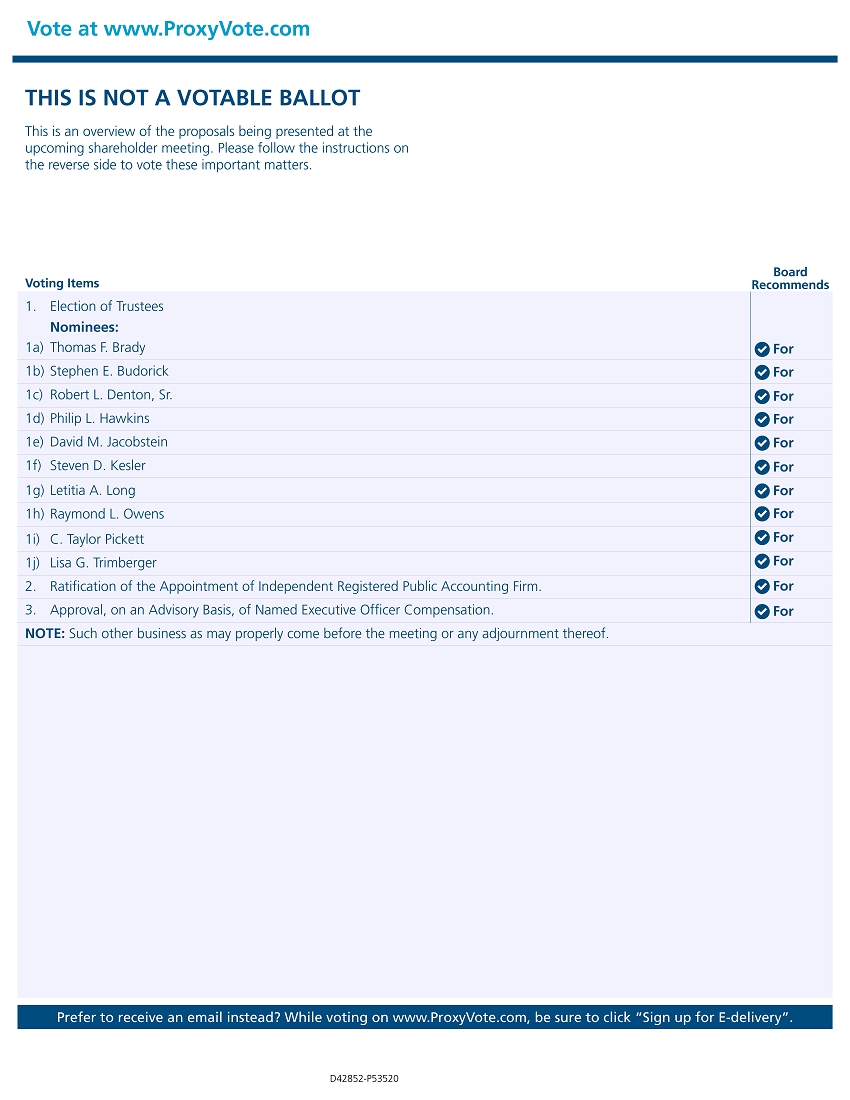 Vote at www.ProxyVote.comTHIS IS NOT A VOTABLE BALLOT This is an overview of the proposals being presented at the upcoming shareholder meeting. Please follow the instructions on the reverse side to vote these important matters.Voting Items 1. Election of Trustees Nominees: 1a) Thomas F. Brady 1b) Stephen E. Budorick 1c) Robert L. Denton, Sr. 1d) Philip L. Hawkins 1e) David M. Jacobstein 1f) Steven D. Kesler 1g) Letitia A. Long 1h) Raymond L. Owens 1i) C. Taylor Pickett 1j) Lisa G. Trimberger 2. Ratification of the Appointment of Independent Registered Public Accounting Firm. 3. Approval, on an Advisory Basis, of Named Executive Officer Compensation. NOTE: Such other business as may properly come before the meeting or any adjournment thereof.Board RecommendsFor For For For For For For For For For For ForPrefer to receive an email instead? While voting on www.ProxyVote.com, be sure to click “Sign up for E-delivery”.D42852-P53520
